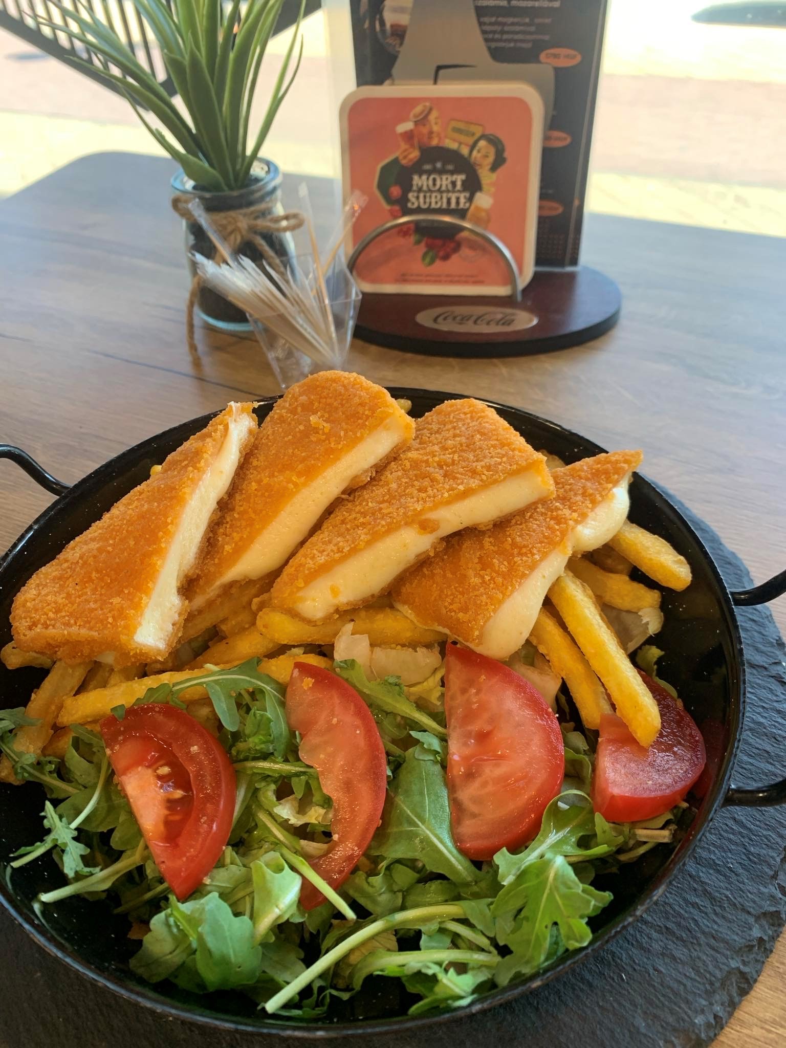 A 150g gyros húst és a vékonyra vágott 25dkg sültkrumplit kemencében megsütjük, olivabogyós feta sajtos görög saláta ágyon tzatziki szósszal tálaljuk.
